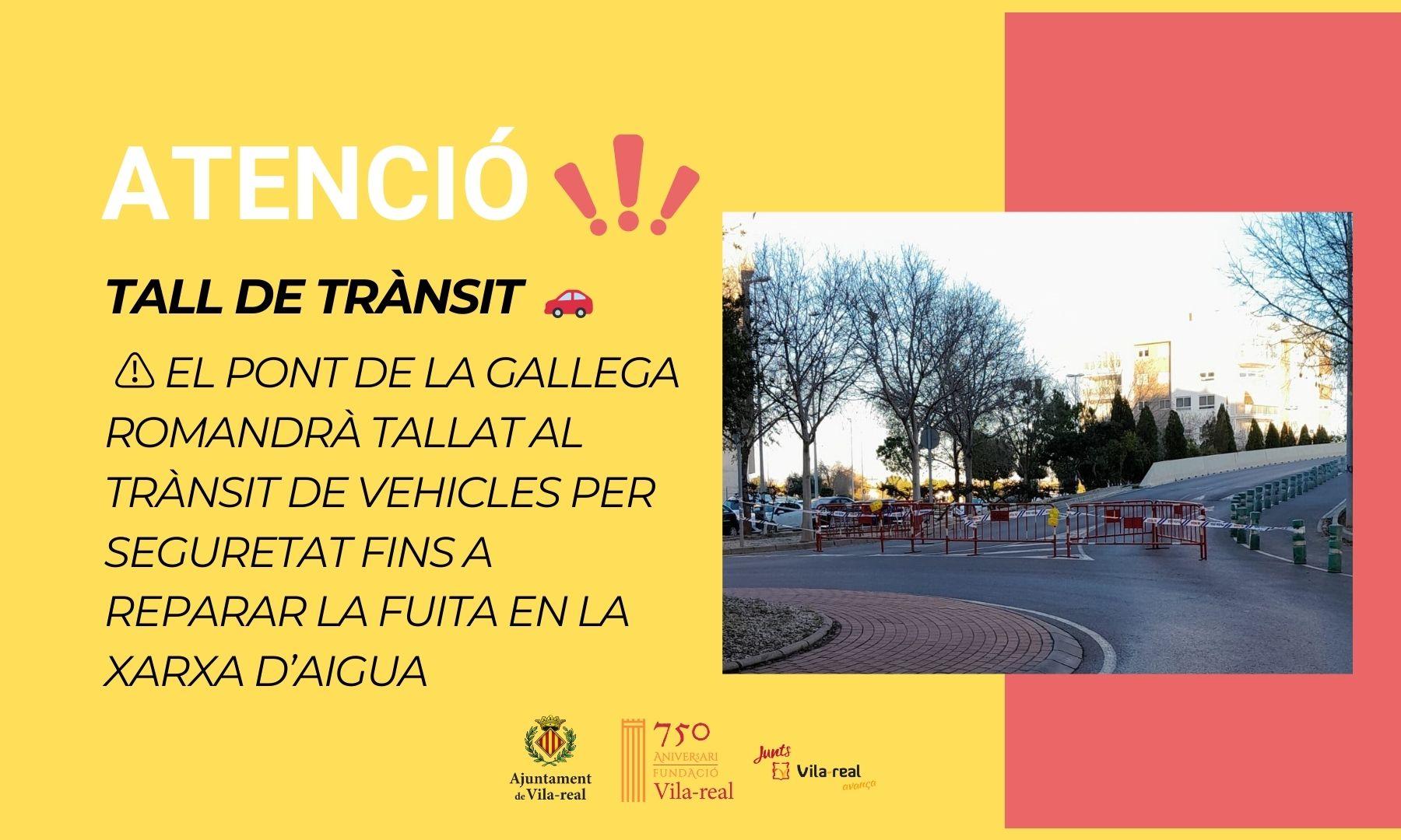 L'Ajuntament ha informat que el Pont de la Gallega romandrà tancat al trànsit de vehicles per motius de seguretat. Aquesta mesura s’ha pres per facilitar els treballs de reparació d’una fuita detectada en la xarxa d’aigua que afecta la zona.