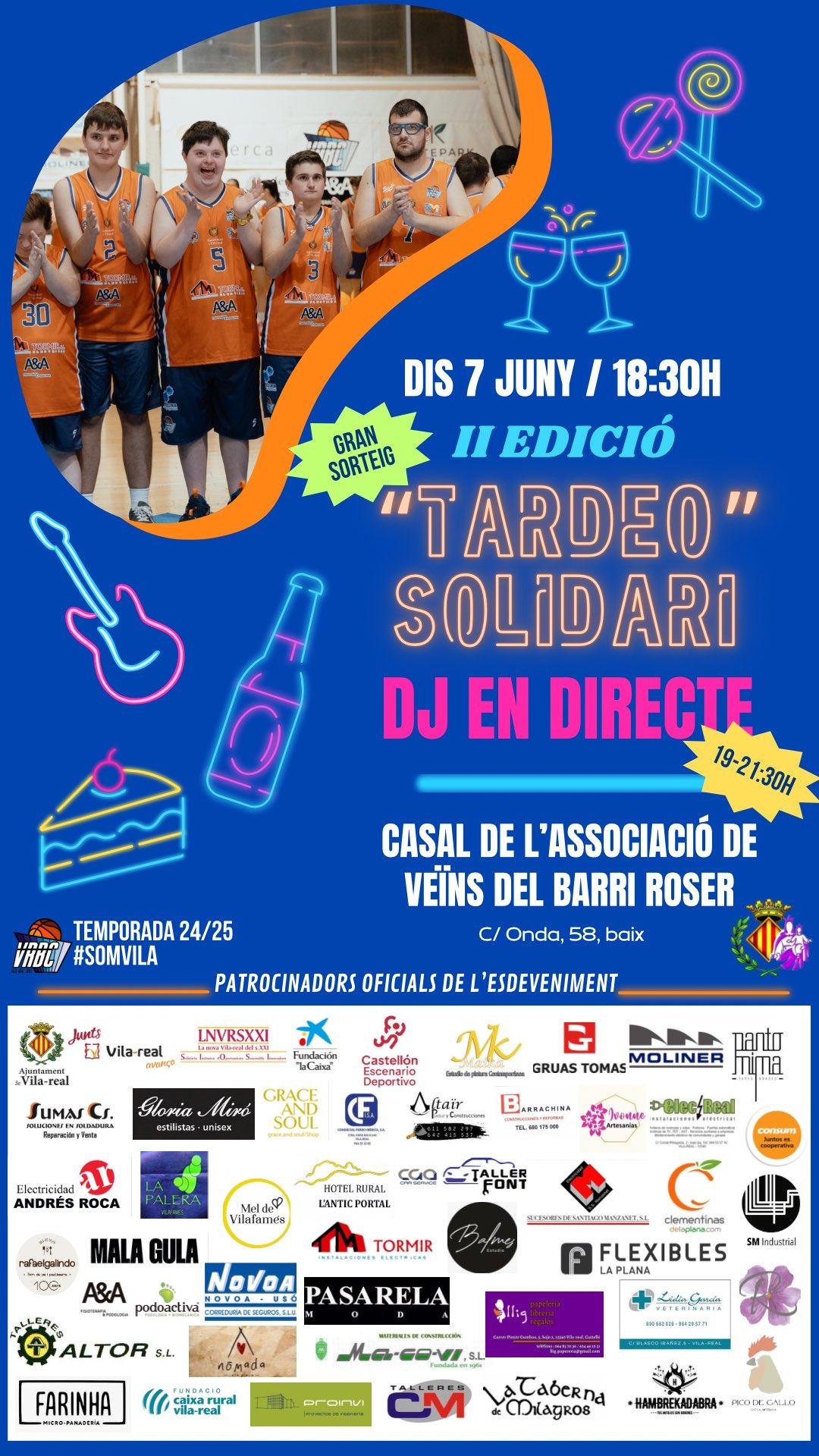 Rosa G. Llobat / Vila-real InformacióEl Vila-real Bàsquet Club celebrarà el pròxim divendres 7 de juny la II edició del "Tardeo Solidari", una cita festiva i solidària que tindrà lloc al Casal de l’Associació de Veïns del Barri Roser (carrer Onda, 58, baix), a partir de les 18.30 hores.