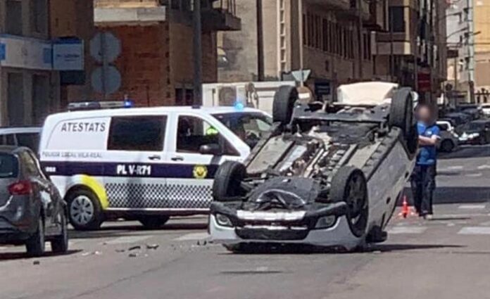 Aquest matí dos cotxes han vist implicats en un aparatós accident de tràfic en l’encreuament entre els carrers Pintor Gumbau i Joanot Martorell. Un dels vehicles ha quedat totalment bolcat després del succés encara que, afortunadament, no ha hagut de lamentar lesions. Una Unitat d'Atestats de la Policia Local de Vila-real ha realitzat diligències pel sinistre vial.