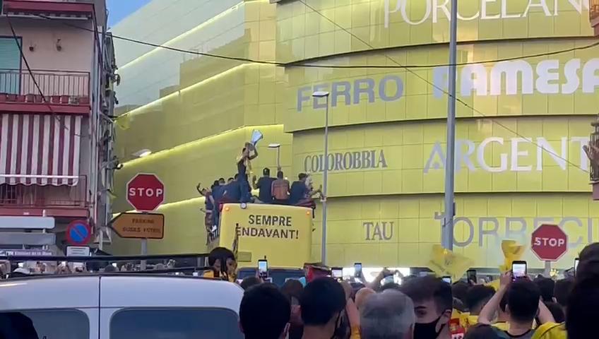 En l’autobús d’una banda es podia llegir ‘Som Campions’, d’una banda, i per l’altra ‘Europa és nostra’ ‘Campions’. Escortats per la policia local, arranque el recorregut pels carrers sembrats de seguidors del Vila-real, tots abillats amb indumentària groga. I és que, pel que sembla, a la botiga del club vila-realenc es va esgotar tot el material: samarretes, bufandes i dessuadores. La copa va ser de mà en mà, sempre en el més alt de l’autobús.