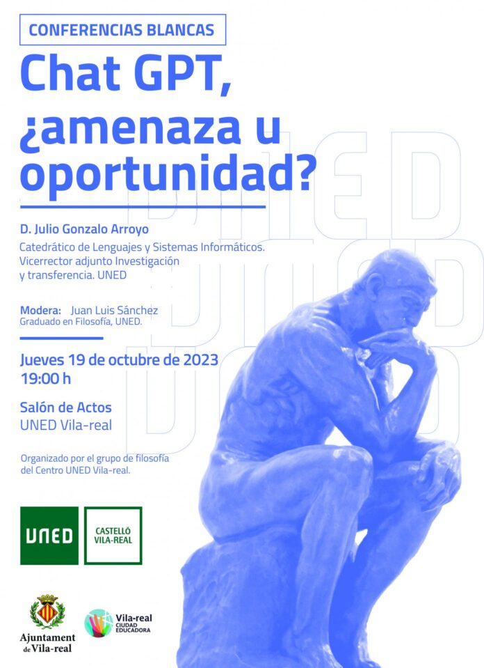 El pròxim 19 d'octubre se celebra una conferència en la sala d'actes de la UNED de Vila-real anomenada "ChatGPT, ¿amenaça o oportunitat?". La imparteix Julio Gonzalo Arroyo, catedràtic de Llenguatges i Sistemes Informàtics, vicerector adjunt d'investigació i transferència.