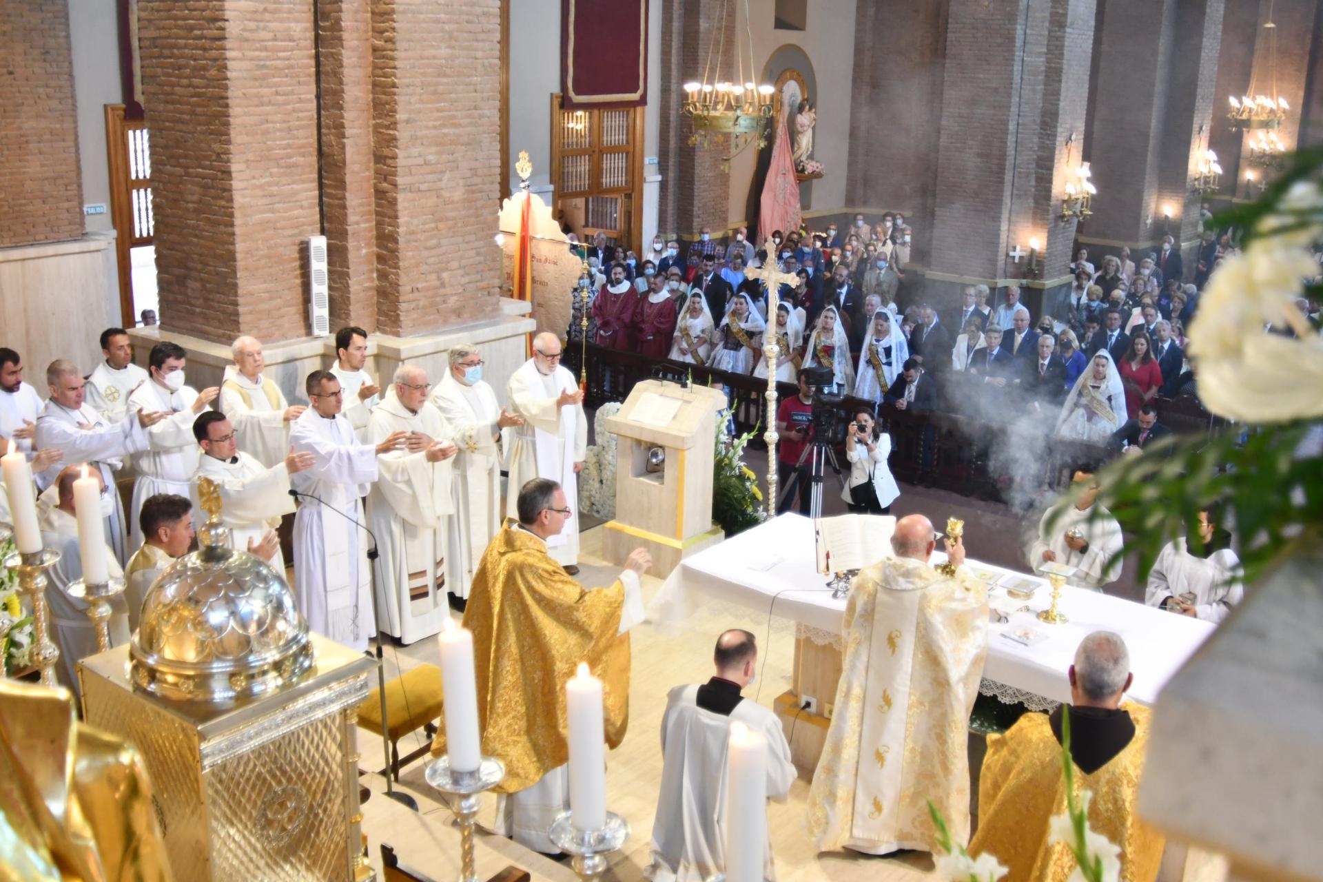 A les 11.00 hores ha sigut la Santa missa pontifical a la basílica de Sant Pasqual, presidida per l’Excel·lentíssim i Reverendíssim Sr. Casimiro López Llorente, bisbe de la diòcesi de Segorbe-Castelló de la Plana, amb la intervenció de la Coral Sant Jaume, Veus de Cambra, Orquestra Supramúsica i Unió Musical La Lira, que interpretaran la missa solemne dedicada a Vila-real del Mestre Rafael Beltrán, amb l’assistència de la reina de les festes, les dames de la ciutat i autoritats.