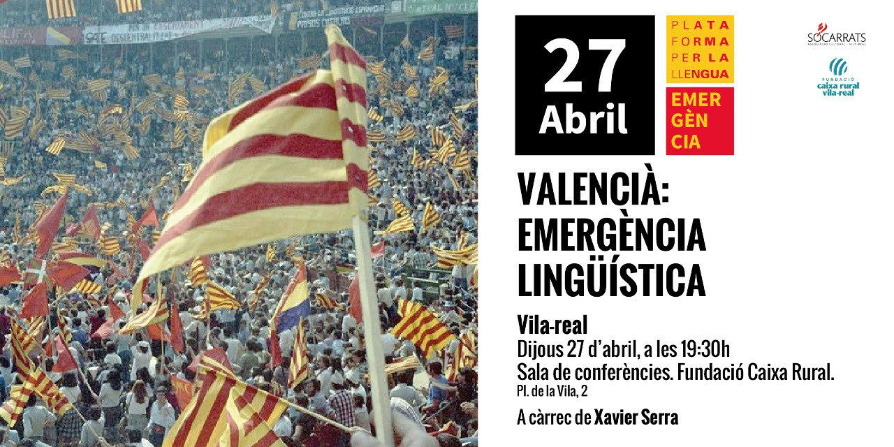 La Plataforma per la Llengua, juntament amb l’Associació Cultural Socarrats, organtitza la xarrada ‘Valencià: emergència lingüística’. Serà a càrrec de Xavier Serra i estarà presentada per la vicepresidenta de l’Associació Cultural Socarrats, Anna Asensio. Així mateix, l’acte es durà a terme demà, dijous 27 d’abril, en la sala d’actes de la Fundació Caixa Rural de Vila-real a les 19:30 hores.