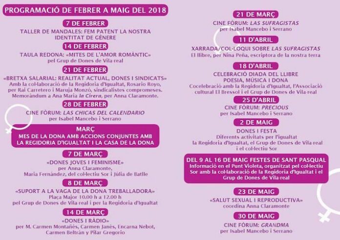 Al marge de les activitats al voltant del Dia de la Dona, la programació d'activitats del Grup de Dones i la Regidoria d'Igualtat continua a l'abril amb una xarrada col·loqui sobre 'Las sufragistas', que tindrà lloc el dia 11 i el 18 se celebrarà la Diada del llibre, poesia, música i dona, que comptarà amb el suport de la Regidoria d'Igualtat, la Associació Cultural El Bressol i el Grup de Dones de Vila-real. El 25 d'abril serà el torn del Cinefòrum Precious, a càrrec d'Isabel Mancebo i Serrano.