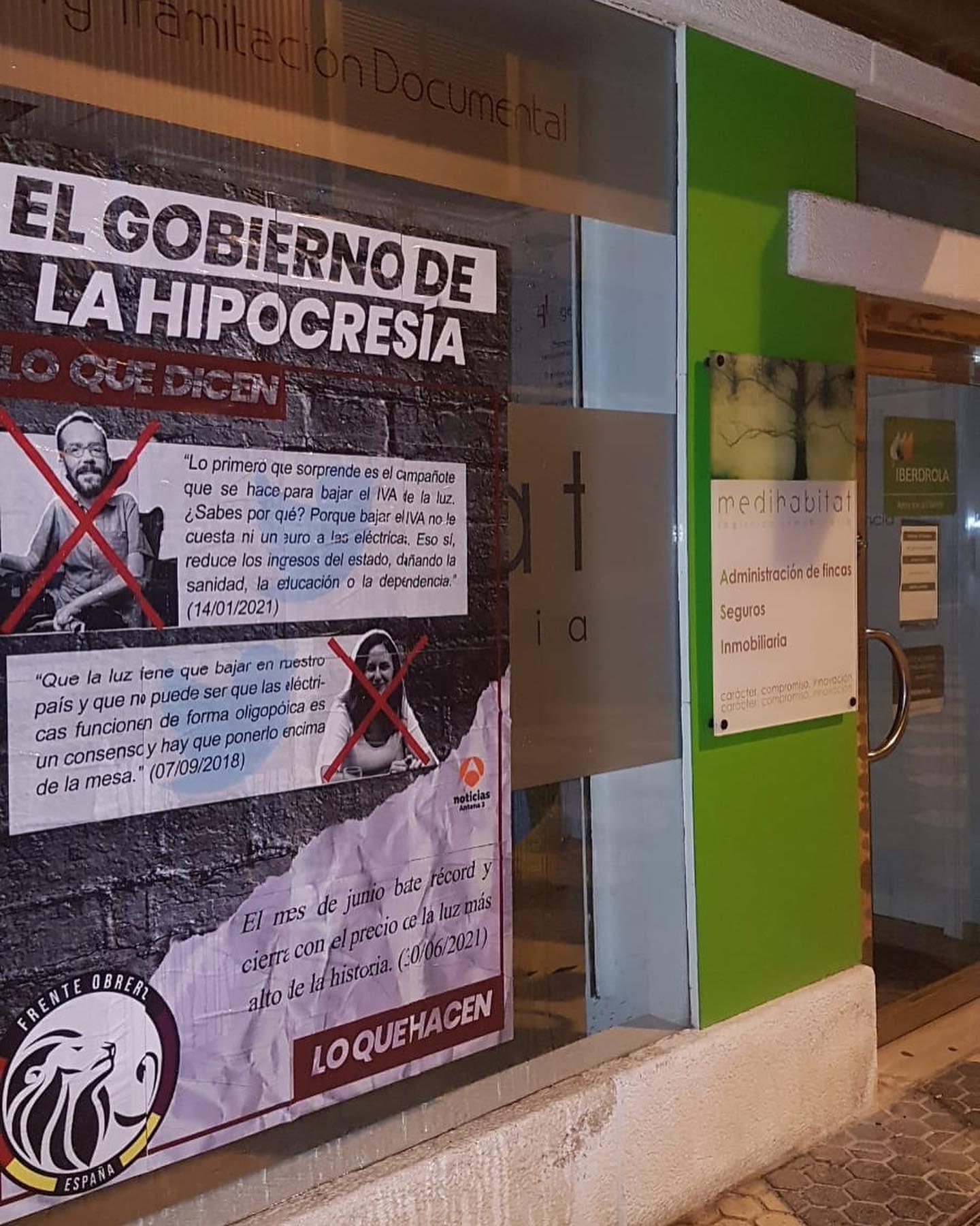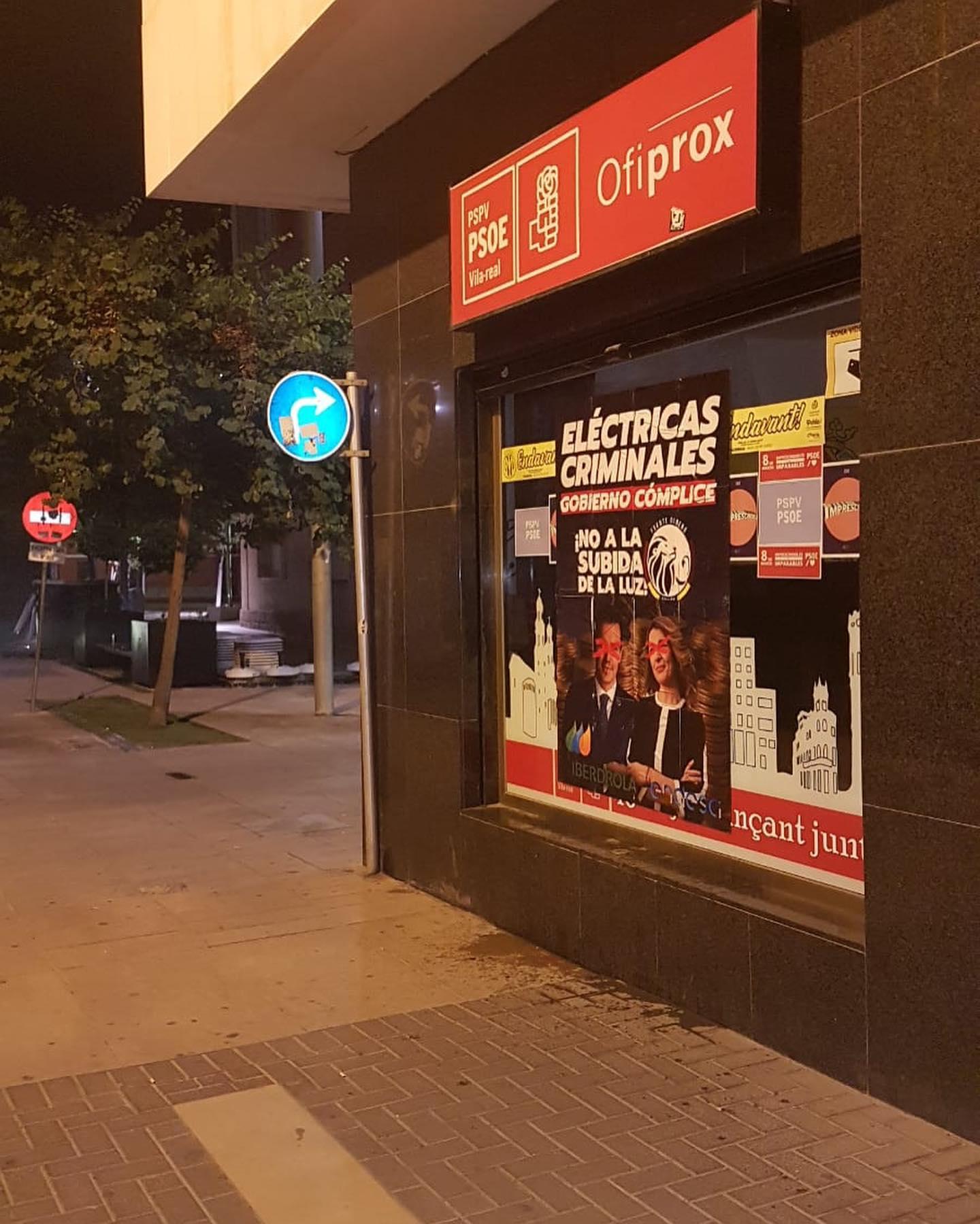 Vila-real comença el dia amb cartells contra l’equip de Govern d’Espanya i les elèctriques col·locades en cristalls de locals com el PSOE o Iberdrola. Els responsables d’aquesta acció, que es repeteix per la resta de la Comunitat Valenciana, és ‘Frente Obrero’, organització política d’esquerres que es defineix com “l’únic moviment polític que representa als treballadors del nostre país“