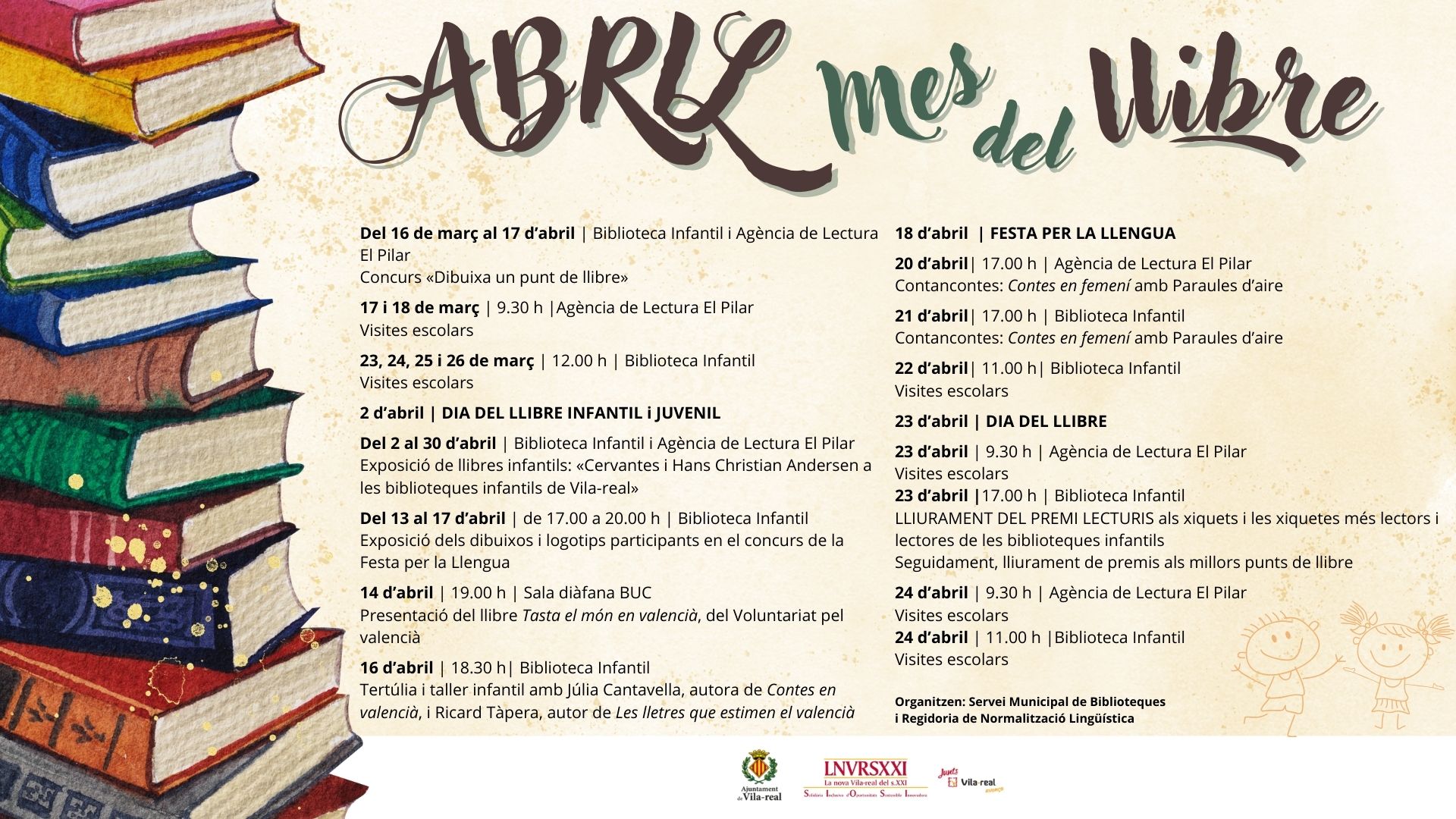 El Servei Municipal de Biblioteques i la Regidoria de Normalització Lingüística de l’Ajuntament de Vila-real han organitzat una completa programació amb motiu del Mes del Llibre, que es desenvoluparà del 16 de març al 30 d’abril amb activitats dirigides especialment a l’alumnat dels centres educatius i al públic familiar.