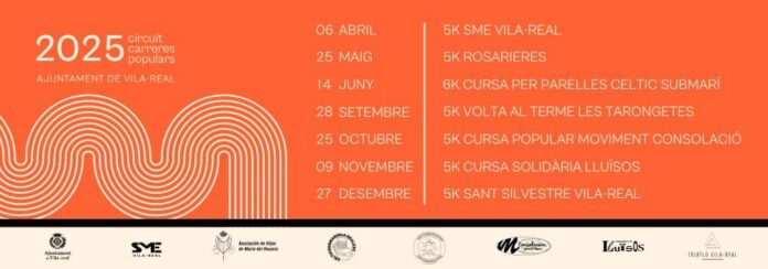 El Servei Municipal d'Esports (SME) de Vila-real ha llançat una nova edició del circuit de carreres populars que inclou set proves entre abril i desembre. Així, la primera de les curses serà l'organitzada per l'SME el 6 d'abril a la qual seguiran el 5K de les Rosarieres (25 maig), el 6K per parelles de la Celtic Submarí (14 de juny), el 5K Volta pel terme de les Tarongetes (28 de setembre), el 5K Moviment Consolació (26 d'octubre), el 5K solidari de Lluïsos (9 novembre) i el calendari, el tancarà un any més, la Sant Silvestre el 27 de desembre.
