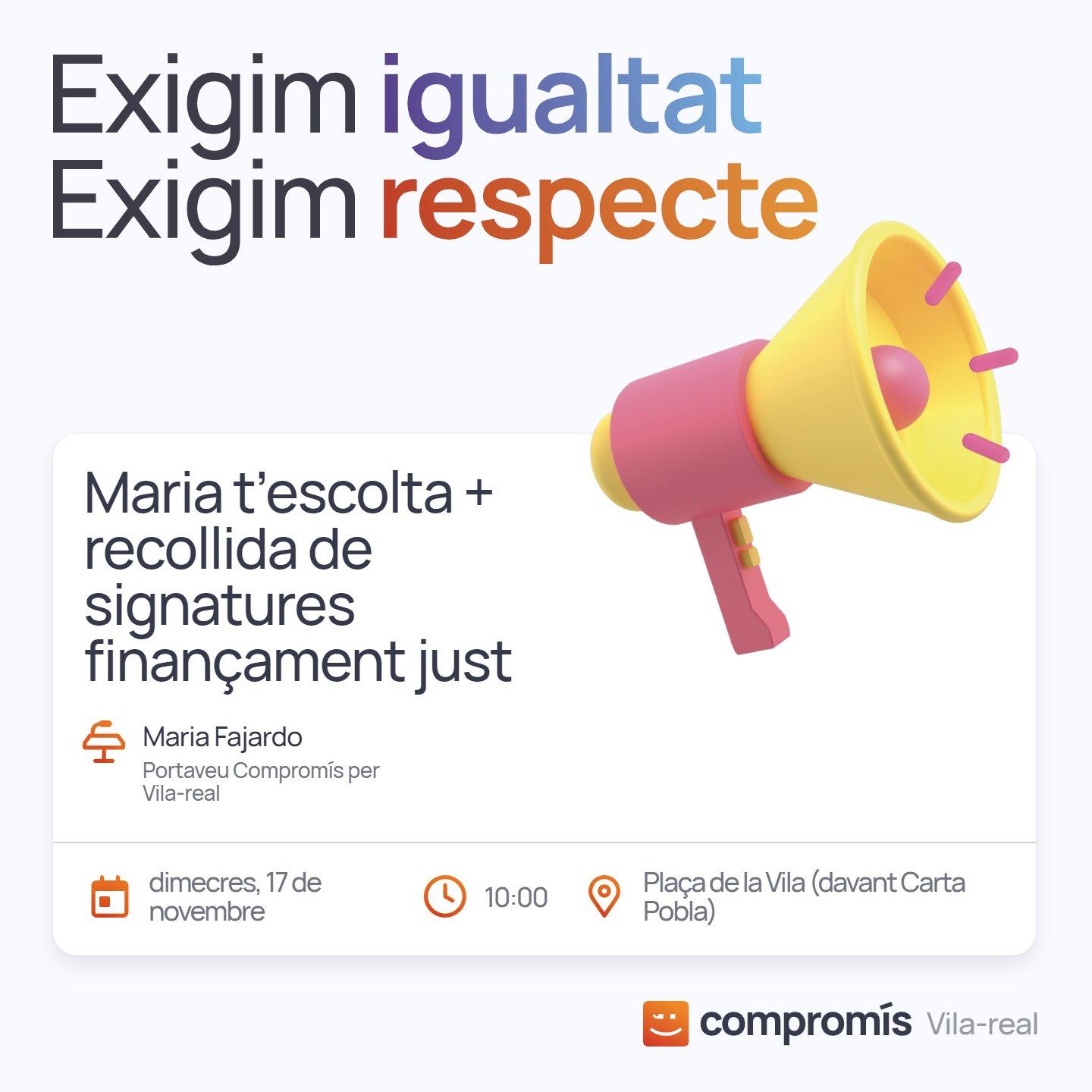 El grup Compromís per Vila-real eixirà al carrer el dimecres 17 de novembre per recollir signatures per un finançament més just. De fet, aquest dissabte 20 de novembre hi ha tres manifestacions simultànies a València, Alacant i Castelló a les 18 hores per exigir un finançament just per la Comunitat Valenciana, una de les que menys diners rep.