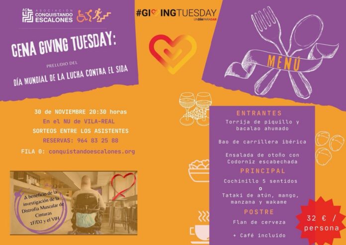 L'Associació 'Conquistando Escalones' organitza, junt amb el restaurant NU, un sopar 'Giving Tuesday' com preludi del Dia Mundial de la Lluita contra la Sida el pròxim 30 de novembre a partir de les 20:30 hores. Els diners recaptats es destinaran a la investigació de la Distròfia Muscular de Cintures 1F/D2 i el VIH.