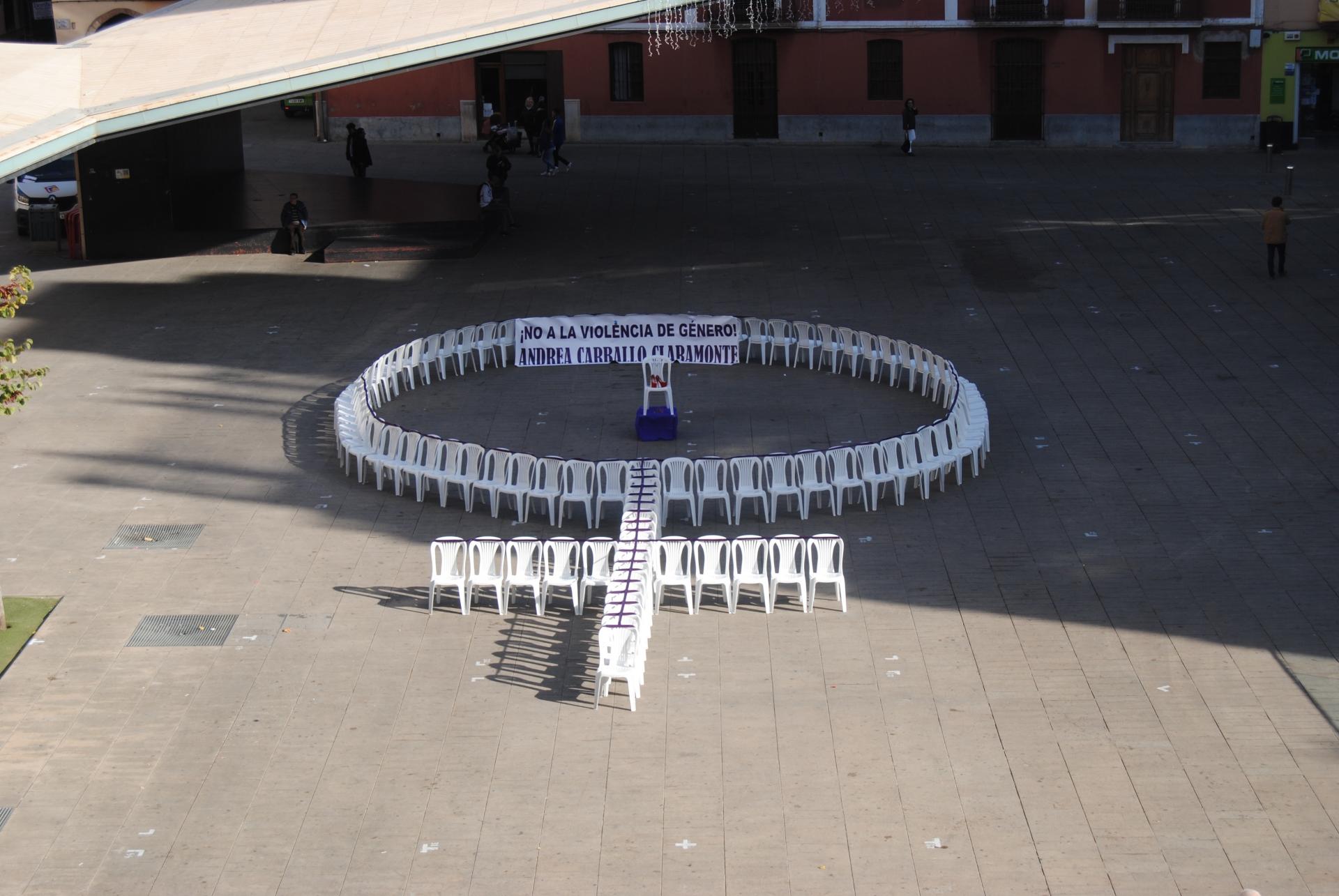 S’ha commemorat el 25N amb a una representació estàtica i s’ha recreat amb cadires el símbol feminista a la plaça Major,  a més de la lactura d’un manifest