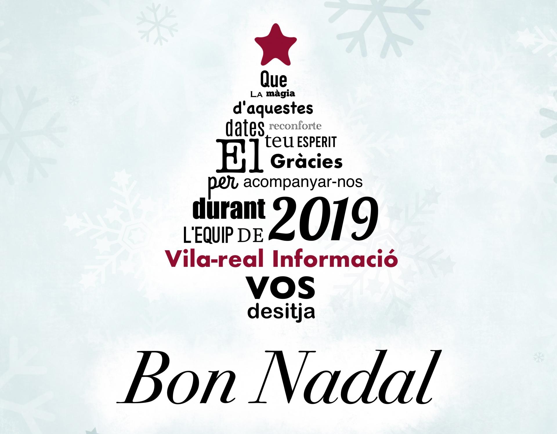 Un altre any més tot l'equip que fa possible Vila-real Informació, periòdic digital referent a la ciutat, vol desitjar als seus lectors unes bones festes nadalenques i, en particular, un moment tan especial com els dies de Nadal. Volem agrair-los la seua contínua confiança en un mitjà en el qual prevalen la transparència i la informació puntual durant els 365 dies de l'any, un projecte periodístic, que dia a dia treballa per informar de l'actualitat de la ciutat des de la independència, apostant per la veracitat i sempre pensant en el que puga ser d'interés als lectors que ens han fet líders de la premsa digital.