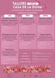 En l’apartat cos s’oferiran tres tallers: consciència corporal, sòl pelvià i hipopressius; gimnàstica funcional i dansa àrab. L’apartat ment inclou dues propostes: cultivem el plaer i escola d’alfabetització i, finalment, els tallers d’educació somàtica i de ioga terapèutic conformen l’apartat ànima. Fajardo ha indicat que algunes iniciatives es repeteixen per la bona acollida que han tingut, segons es desprén de les enquestes realitzades a les usuàries. En aquesta edició s’ofereixen 117 places, amb un sistema de matrícula que estableix un preu simbòlic d’un euro per hora i es preveuen bonificacions.