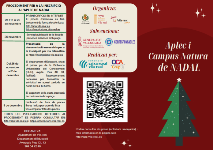 L'Ajuntament de Vila-real, a través de la Regidoria d'Educació, ha llançat una nova edició de l’Aplec de Nadal i el Campus Natura, amb l'objectiu de facilitar la conciliació familiar durant les vacances escolars i oferir alternatives educatives i d'oci a la infància.