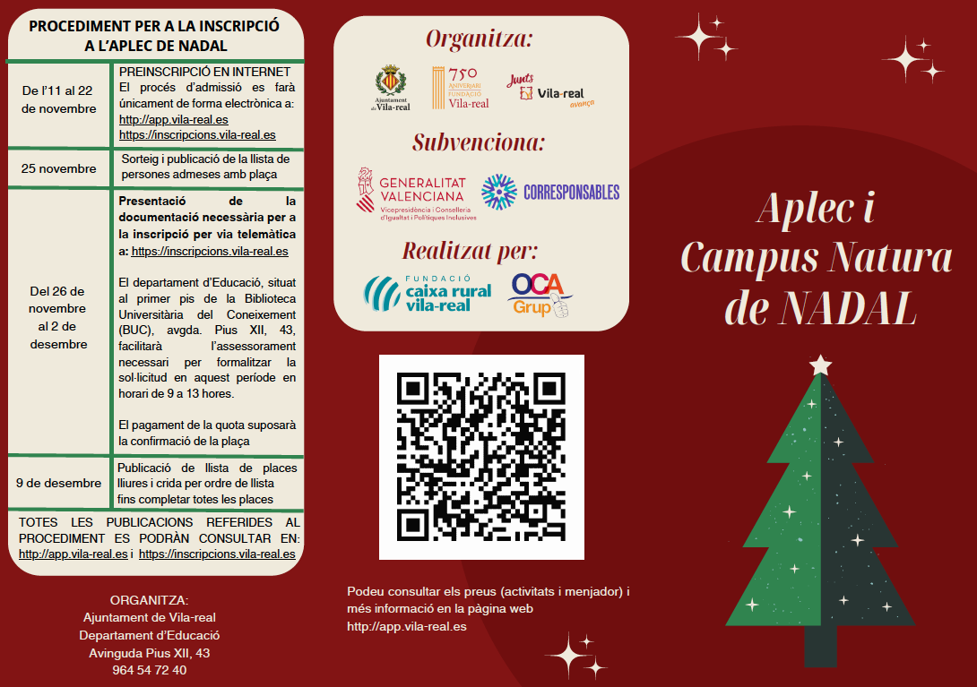 L’Aplec de Nadal es realitzarà els dies 23, 24, 27, 30 i 31 de desembre, així com el 2 i 3 de gener, i comptarà amb 120 places distribuïdes entre els col·legis Pius XII i José Soriano. Aquesta activitat està dirigida a xiquets i xiquetes nascuts entre 2021 i 2011 i escolaritzats en els centres educatius de Vila-real.