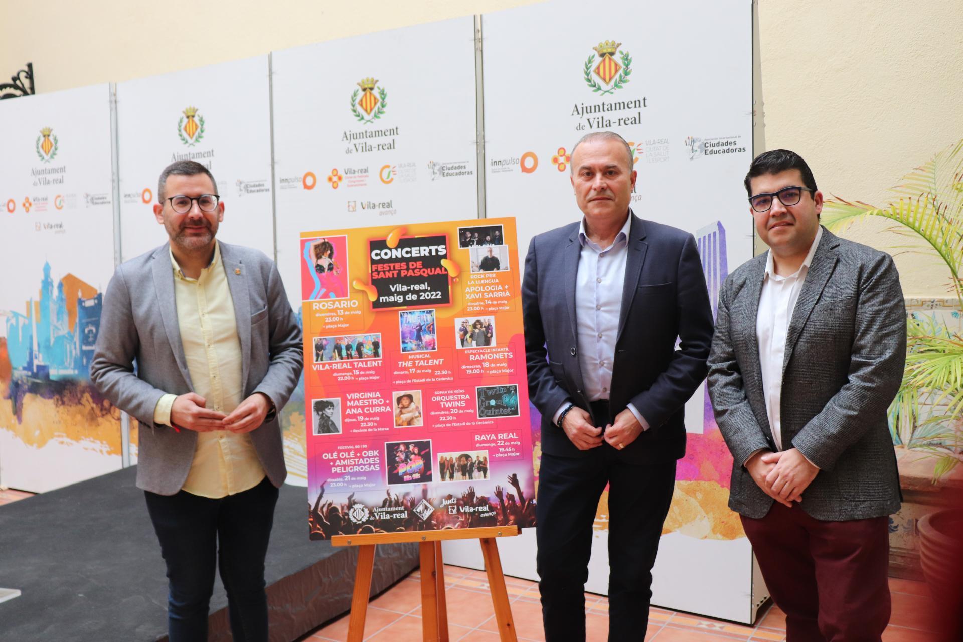 Les festes en honor a Sant Pasqual, que se celebraran del 13 al 22 de maig, començaran amb l'actuació de Rosario, el mateix dia 13 de maig a les 23.00 h en la plaça Major. L'endemà, 14 de maig, a la mateixa hora i en el mateix lloc, Rock per la llengua amb el grup Apologia i Xavi Sarrià. El diumenge dia 15 de maig, a les 22.00 h, en la plaça Major es durà a terme l'espectacle Vila-real Talent, amb Spanish Brass com a artista convidat, al costat d'una àmplia llista d'agrupacions i artistes locals. El dia 17 de maig, a les 22.30 h, en la plaça de l'Estadi de la Ceràmica, es podrà veure el musical The Talent, i el dimecres 18 de maig, a les 19.00 h en la plaça Major hi haurà un espectacle infantil a càrrec de Ramonets.