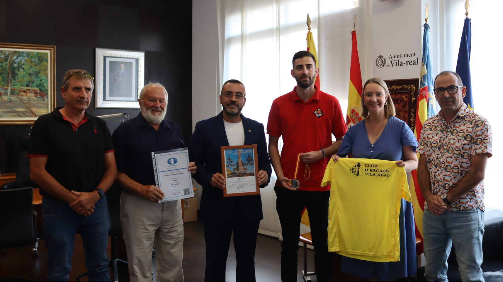 A continuació, s’ha retut homenatge a Sergio Romero Calduch, membre del Club d’Escacs de Vila-real, per la seua trajectòria al món dels escacs i assoliments tan destacats com el títol de Mestre FIDE i la seua primera Norma de Mestre Internacional en el X Campionat Iberoamericà 2024. En la recepció també han participat el president del Club d’Escacs de Vila-real, Ildefonso Alamillo, i el vicepresident, Jorge Romero, en representació de l’entitat.