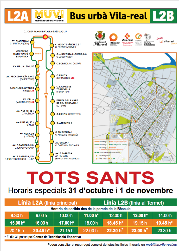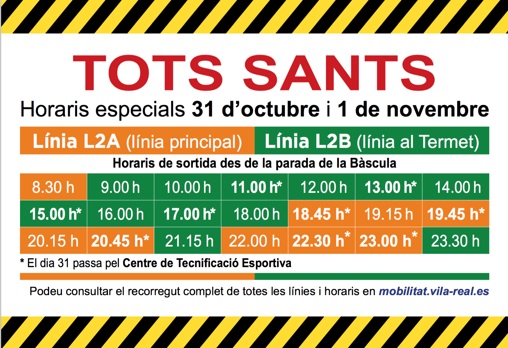La commemoració del dia de Tots Sants comptarà, com cada any, amb un dispositiu especial, en el qual destaca el servei d’autobús especial per a garantir el transport públic i gratuïta tots els vila-realencs que vulguen acostar-se al cementeri eixe dia o la vespra. Per a això, el bus Groguet es reforça i adapta els seus horaris els dies 31 d’octubre i 1 de novembre.