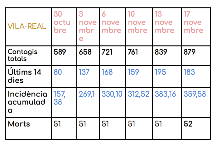 Vila-real registra una nova mort per Covid-19 i ja suma 52 decessos, després de setmanes en les quals la xifra s’ha mantingut estable, en 51. Així mateix, després un repunt dels contagis de l'última setmana, els contagis s’han relaxat i els casos actius han passat de 195 a 183. La incidència acumulada ha disminuït 23,5 punts, passant de 383,16 a 359,58 i els contagis des del divendres a hui han pujat en 40 casos.
