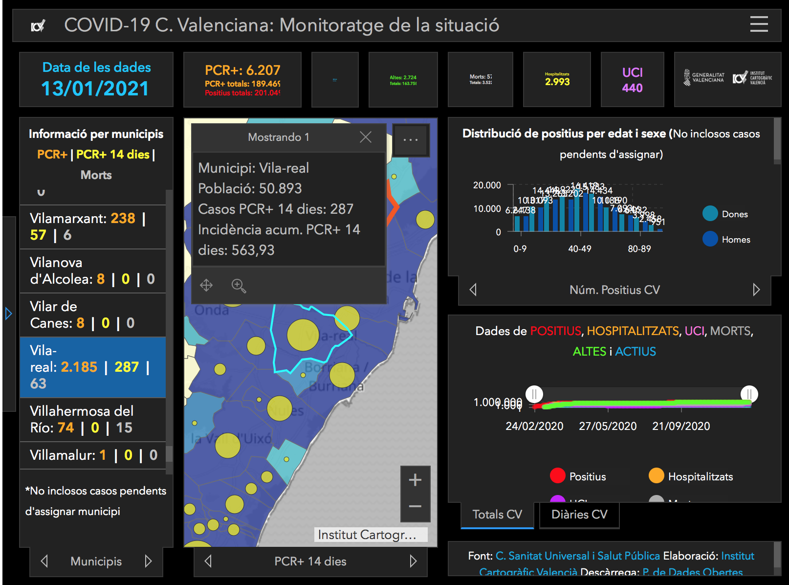Empitjora la situació sanitària per la Covid-19 a Vila-real i és que la ciutat ha arribat als 2.185 contagis des de l’inici de la pandèmia. Només des del dimarts han augmentat els casos en 145 i s’ha produït un nou decés (63). Així, Vila-real compta amb 287 casos en els últims 14 dies per cada 100.000 habitants i la Incidència Acumulada ha repuntat fins a 563,93, 76,6 punts més que en la última actualització. Així mateix, ahir la Conselleria de Sanitat va notificar tres brots d'origen laboral, amb un total de catorza persones afectades. No vol dir que totes residisquen a Vila-real, sino que s'han produït en el lloc de treball ubicat a la ciutat.