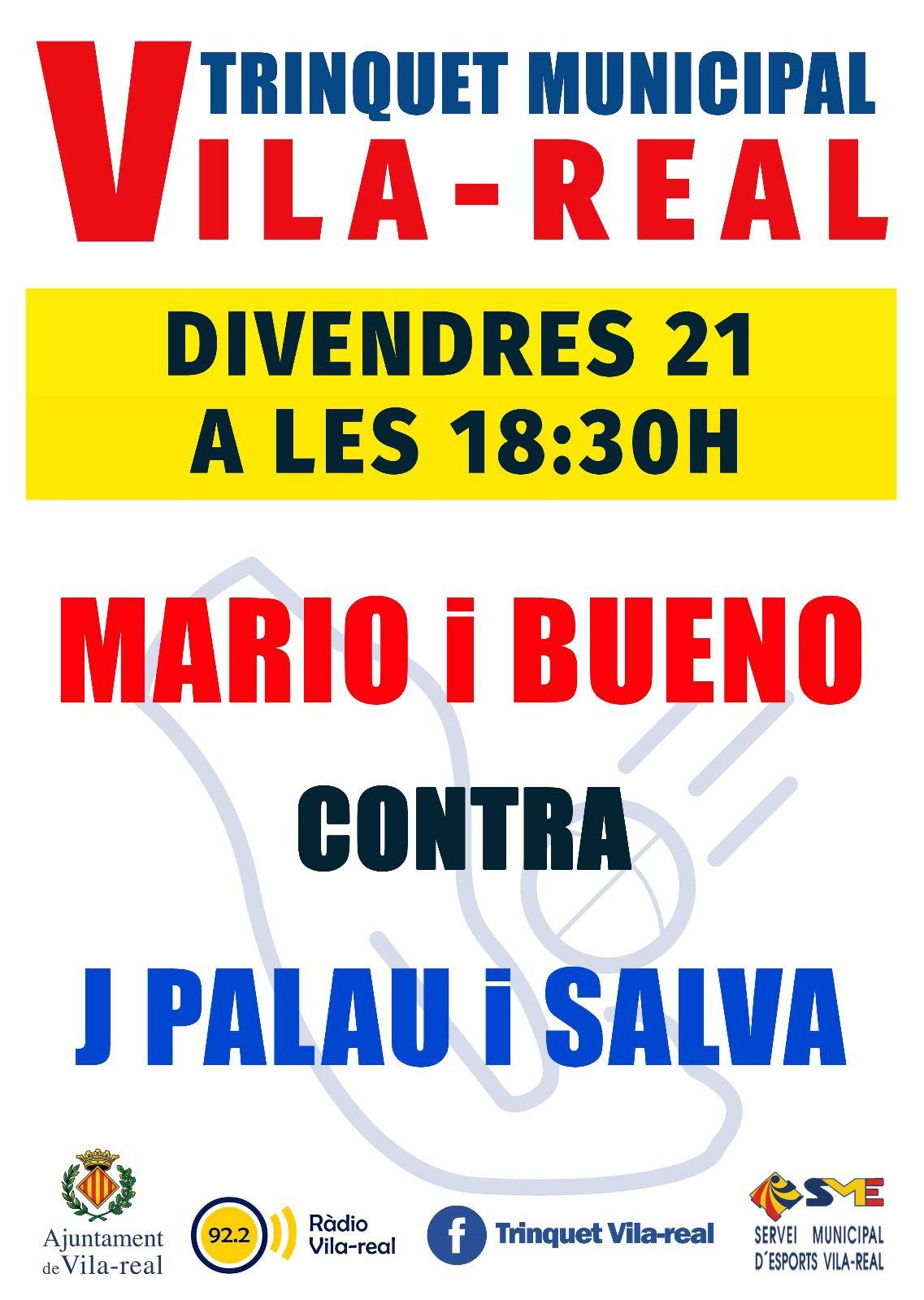 El pròxim divendres 21 de març, a les 18:30 h, Vila-real serà l’escenari d’un gran partit de pilota entre Mario i Bueno i J Palau i Salva. Aquest enfrontament promet ser una jornada plena d'emoció i competitivitat, amb dos equips disposats a donar-ho tot per aconseguir la victòria.