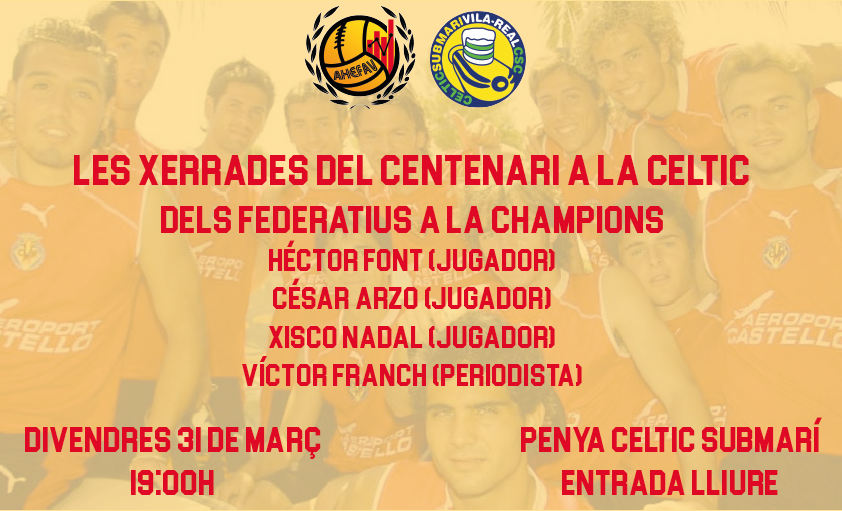 Després de la bona acollida de les dos primeres xerrades, este 31 de març continua el cicle el divendres a les 19 hores en la seu de la penya Celtic Submarí de Vila-real amb els protagonistes que van iniciar la seua trajectòria als camps federatius i que van aconseguir arribar a disputar competicions europees amb el club del seu poble. Des de la penya Celtic Submarí i l’AHEFAV animen a totes aquelles persones que estiguen interessades en presenciar la xerrada que acudisquen a la penya Celtic, amb entrada lliure, per passar una estona agradable coneixent un poc més el club i les seues històries, així com recordant els moments viscuts amb aquella gent que els va viure en primera persona.